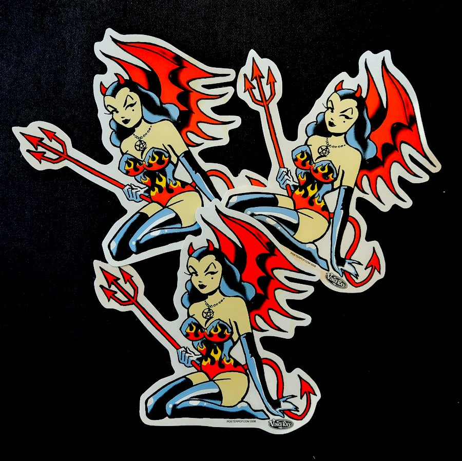 Vince Ray`s Devil Girl stickers are glossy, high quality stickers, printed by Poster Pop. When the white paper backing is pealed off the white edging disappears to reveal the sea through base.
