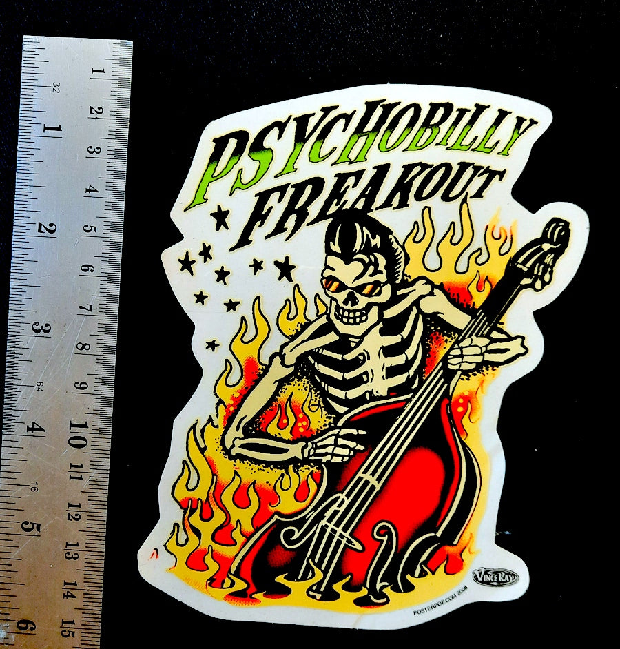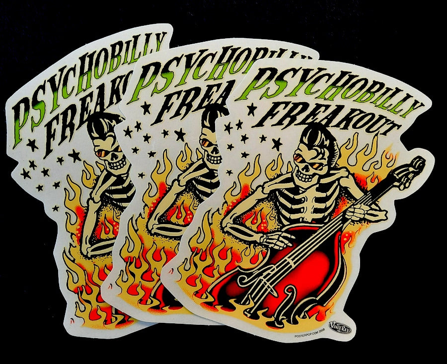 Vince Ray`s Psychobilly Freakout stickers are glossy, high quality stickers. When the white paper backing is pealed off the white edging disappears to reveal the sea through base.